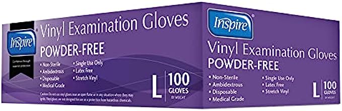 Vinyl Imported PRE-COVID QUALTY: Remember when disposable gloves were strong, rip free and durable? These Inspire Gloves are the Original Quality. Say NO to cheap gloves that do NOT offer adequate protection. Inspire Vinyl gloves offer the security and strength demanded by today's professionals. Also see our Inspire Nitrile Gloves and a full selection of Inspire gloves disposable latex free, latex gloves , rubber gloves and medical gloves. VINYL STRETCH - STRENGTH AND DEXTERITY: Inspire Stretch Vinyl Gloves provide strong protection every time. Rugged vinyl material is rip and puncture resistant, yet offers a secure fit, ease of movement, superior tactile control, and ultimate dexterity. TRUSTED BY PROFESSIONALS: The exam grade glove trusted by medical professionals. Whether emergency services, doctors, nurses or food and household use, Inspire disposable gloves hold up to the job at hand. Medical gloves you can put your trust in. LATEX FREE PROTECTION: Inspire vinyl gloves are NOT made with any latex in production. Powder Free Nitrile Stretch gloves. CONFIDENCE - GLOVES THAT HOLD UP TO THE JOB AT HAND: When your protection is on the line, you demand a glove that will hold up. Inspire Gloves give you the confidence to tackle all scenarios securely and safely. 100 gloves per box, 1000 gloves per case. Case of 10 boxes