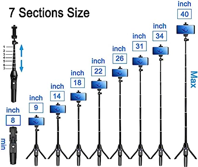 【3-In-1 Selfie Stick and Tripod Stand】Selfie stick tripod can be extended between 8.07 to 40 inches, which makes it very suitable for Photograph, Face time, Business, living broadcasting more. It features a fully expandable handheld selfie stick handle with built-in collapsible legs that allow it to double as a stand-alone tripod when opened. You can easily switch between Selfie Stick Mode & Phone Tripod Mode for your preferred use.