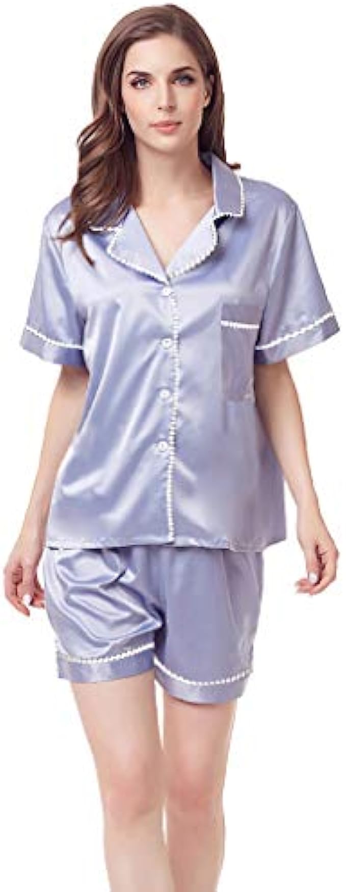 Women Silky Satin Pajamas Short Set Plain Matte Two-Piece Pj Sets Button-Down Sleepwear With Contrasted Piping