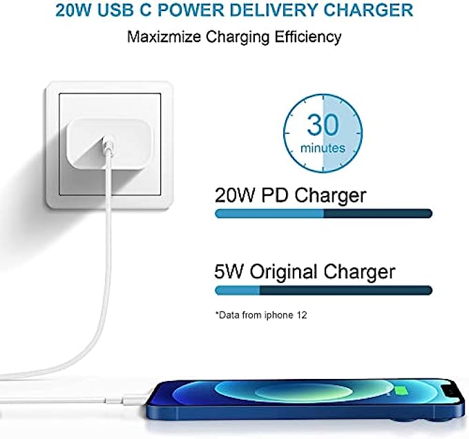 【Romitaz PD 3.0 Fast Charger for iPhone】 iPhone Fast Charger equipped with 20W PD 3.0 USB Type C power delivery wall plug, PD 3.0 Quick-Charge USB C port provides Max 20W output power, charge your device up to 3x faster than original 5W charger,charging your iPhone 12 up to 50% in just 30 minutes, saving over 1.5hrs for you. 【Apple MFi Certified Lightning Cord】 With the Apple MFi Chip, the USB-C to lightning cord equips automatic chip recognition function. The Apple MFi Certification ensures 100% flawless compatibility with Apple devices. No more trigger warning messages. 【Applicable Apple Equipment】 Use the official iPhone lightning cable with Romitaz 20W USB C wall charger to access fast-charging for iPhone13/ 13 Pro/ 13 Pro Max/ 13 mini, iPhone 12/ 12 Mini/ 12 Pro/ 12 Pro Max/ SE 2020/ 11/ 11 Pro/ 11 Pro Max/ XS/ XS Max/ XR/ X, 8/ 8 Plus, iPad, iPad Pro, iPad mini, iPad Air. This Romitaz Power Delivery 3.0 FAST charger also charge for iPhone 7 6 Plus, iPhone 5 5c 5s SE Airpod in a original charging speed. 【Safety Efficient Fast Charging】 The Power Delivery Wall Charger for iPhone owns bulit-in multi-protection system, avoiding from over-voltage, over-charge, over-heat, etc. The smart chip including in the MFi certified lightning cable match the current required by the Apple device automatically, charge your iPhone/iPad device fast, safely and steadily.Tangle-free 6 Feet length is convenient for usage while charging and sync at home/office/travel in bed, hotel rooms, and more. 【What You Get】1x 6FT Cable and 1 x USB C Wall Charger.